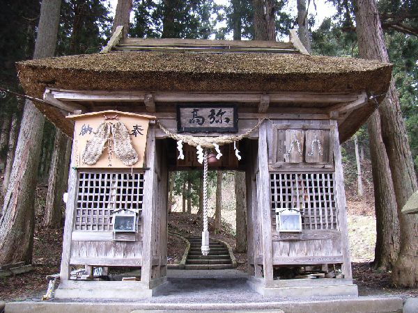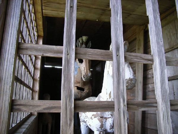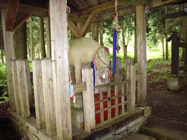| (3)神馬− | 基本的に随神門内部に鎮座しています。通常、神社の境内に小さなお堂を建てそこに奉納するのですが、峰吉川の高寺観音堂は高寺観世音(馬頭観音)が祭られていたことで馬が神格化され、数体の神馬が山門に奉納されています。西馬音内の御岳神社などでは奉納された神馬の股をくぐると子供の疱瘡が治ると信じられていました。