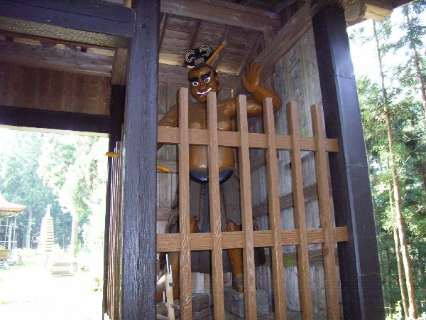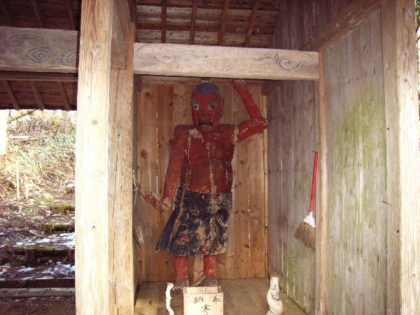 | (1)金剛力士像- | 基本的に仁王門に鎮座し、左右に「阿」「吽」の2体あります。寺院建築の山門に見られる金剛力士像と同じ意味合いで、神社の御本尊を守っています。秋田県内に見られる金剛力士像や仁王像は京都や奈良といった、所謂中央のものとかなり雰囲気が異なり、その朴とつした風合いは秋田県の県民性を現したいるかのようです。下記にある写真以外でも大国主神社や波宇志別神社、小沼神社、戸波神社の仁王像にも同じ事が言え地域の彫刻の特色と言えます。