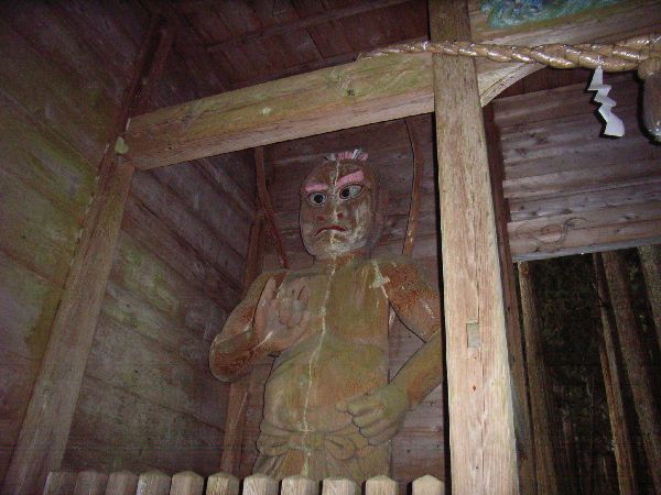 | (5)随神− | 随神とは本殿に祭られている主神に随行している神様の事で、主神を守護するという役割を持っています。その為、随神門に安置され境内に主神に害をなすものを防いでいるのです。全国的にみると神仏分離令が発令する前は仁王像を祭っていた場合も多かったと言えます。随神は武装した武人に模られており、左大神などと呼ばれています。