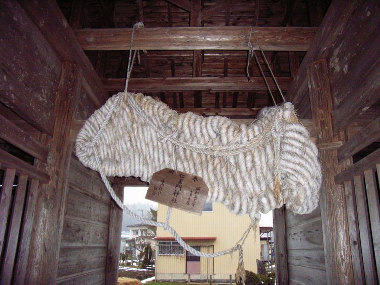 | (2)大わらじ− | 基本的に仁王門にあり金剛力士像や仁王像とセットになっている場合が多いです。大わらじには悪霊退散や旅の安全祈願、厄除けなどの意味が込められていて複数のわらじが奉納されている事もあり山門自体が神格化されている場合もあります。大わらじが奉納れる波宇志別神社の仁王門は仁王門神社と呼ばれ、横手市醍醐にある八幡神社や同市の旭岡山神社にもわらじが奉納されています。