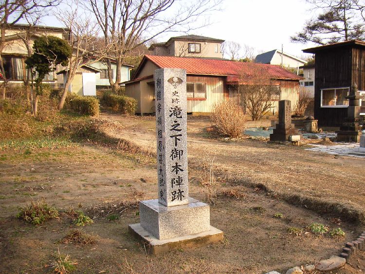 石碑は2本あり「滝の下御本陣跡」、「由利郡境御陣所跡」、「秋田藩郷倉屋敷跡」、「浜田尋常小学校跡」、「相原宗家拝領屋敷跡」とあります。想像すると、浜田集落の名主だった相原家の屋敷は江戸時代は関所のような機能を持っていて、戊辰戦争の際は本陣となったといことかも知れません。他の資料には寛永20年から沿岸部(浜田集落)に唐番所を設けたとの記述もあるので、係わりがありそうです。明治時代に入ると小学校に利用されたようです。現在は畑になり、隣に一族の墓と思われる墓地があり大きな五輪塔もあります。