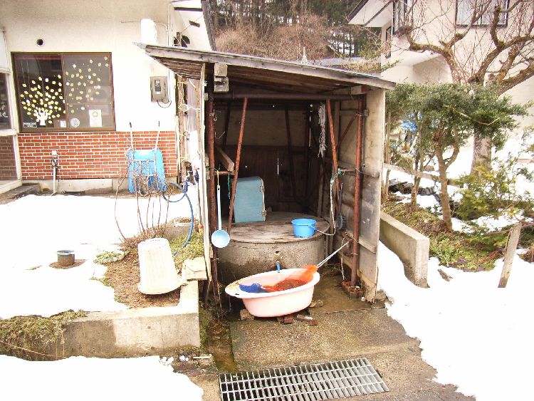 萱ヶ沢集落には共同井戸が現在でも使われています。当然水道等は普及しているとは思いますが、街道沿いに設置されていて誰でも使える様です(?)。小型のポンプで汲み上げられているのか、水口は延々と水が流れ出て、桶に水を溜め野菜や果物などを冷やすのには丁度良いのかも知れません。簡易な屋根を設え、内部には掃除用具なども備え付けられています。その為、周辺は清潔に保たれていて現役さが感じられます。
