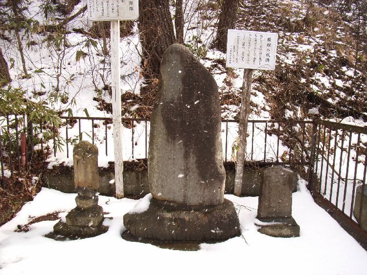 に入る前の飛坂の途中に板碑と経塚があります。案内板によると板碑には「板碑とは板状の碑に梵字を刻み身分の高い人や金持ちの人の墓標として作られた。ここの板碑は応永年代(1400年ころ)のものである。」とあります。又、経塚には「経石7万個、小石1個に経文1字を書き塚下約1メートルの土中に埋めその上に塚をたてたもの明和2年(1765年)池内益族建立と伝えられている。」とあります。