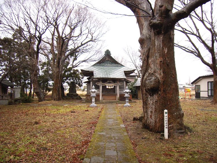 があり石畳が拝殿まで伸び、数本のけやき(井川町指定保存樹)の大樹が歴史を語っています。明治元年に薬師神社や若宮八幡宮と合祀し、境内には様々な石碑や板碑などがあり信仰の深さが分かります。