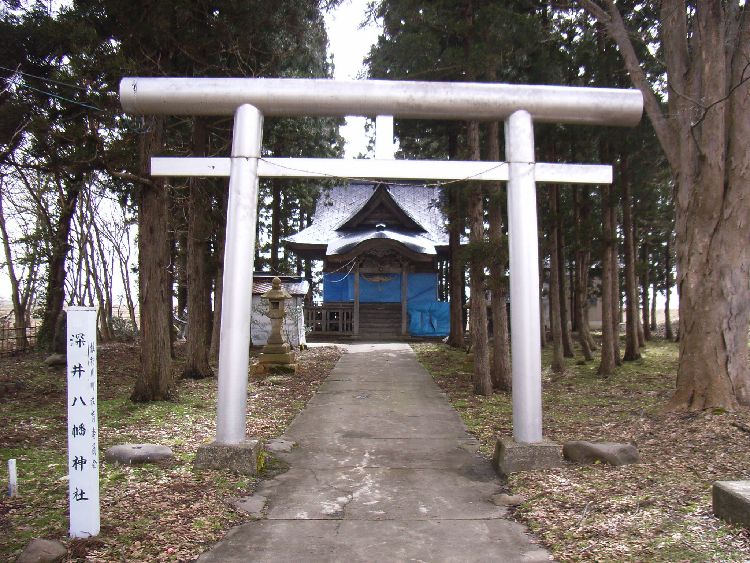 深井八幡神社は深井集落境、旧船場の近くに鎮座して、創建は天正年間と云われています。現在の建物の年代はよく分かりませんでしたが、かなり古いような印象を受けました。拝殿に施された彫刻はかなり細かく凝った造りになっていて龍を中心に水を感じさせる彫り物が施されています。本堂は桧皮葺きで鞘堂に納まっています。境内には多くの祠や庚申塔などの石碑があり集落の信仰を集めていた場所だということが分かります。又、神社内に奉納された舟絵馬は当時の雄物川舟運の様子がわかる資料として大変貴重なもので、旧雄物川町(横手市)の指定文化財になっています。