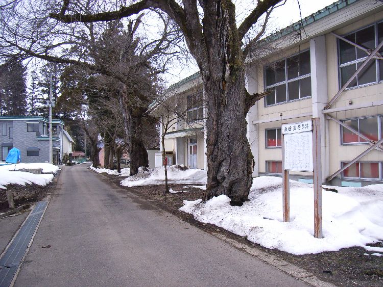 柴田監物邸跡は案内板によると「初代柴田監物平茂高は、山形の戦国武将最上義光の家士であったが、慶弔8年(1603)当田村地方に来て多くの田畑を開墾し、寛永19年(1642年)73才で死去するまで、この地の人々に農耕を教えり纏め、田村の開祖と呼ばれている。監物が上田村から順次開墾してこの地まで来ると、鍬先に大きな石があったので掘ってみると、建物の土台石のように9尺7間4方にきちんと並んでいた。不思議に思い、近くの老人に尋ねると、坂上田村将軍が創建した毘沙門堂の跡だと告げられたので、由緒ある霊場であるとして、その中央に大社を再建した。・・・・(中略)監物邸は、田村小学校を中心として神社参道東側一帯の50間四方に濠を廻らした広い敷地だったとされ、屋敷の西南には上祖茂高の神霊を祀った「桜の社」と呼ばれていた所もあり、・・・・(中略)現在は往時を偲ぶ跡はないが、昭和始めの頃までは濠が残っていて魚釣も出来たという。柴田家は初代茂高公から数え18代目にあたる、キセ氏が家を守っている。」とあります。