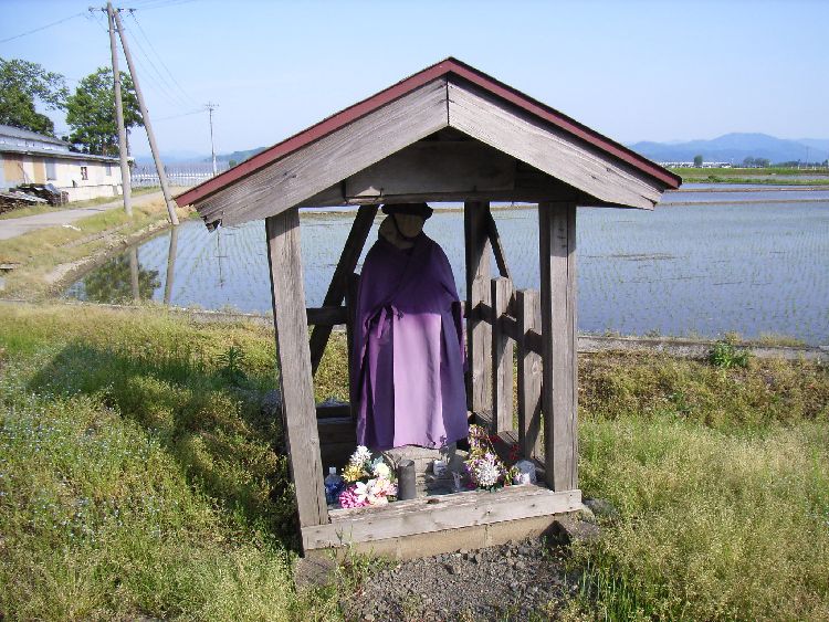 植田集落には多くの庚申塔が古四王神社の境内にある為か、道路沿いにはあまり見かけませんでした。集落手前には1体のお地蔵様が道祖神的な役割をして集落へ悪霊や疫病など入って来ないよう守っているようです。やや大き目で屋根付き祠に安置され、前掛や花などが飾られているところから信仰が現在でも続いています。