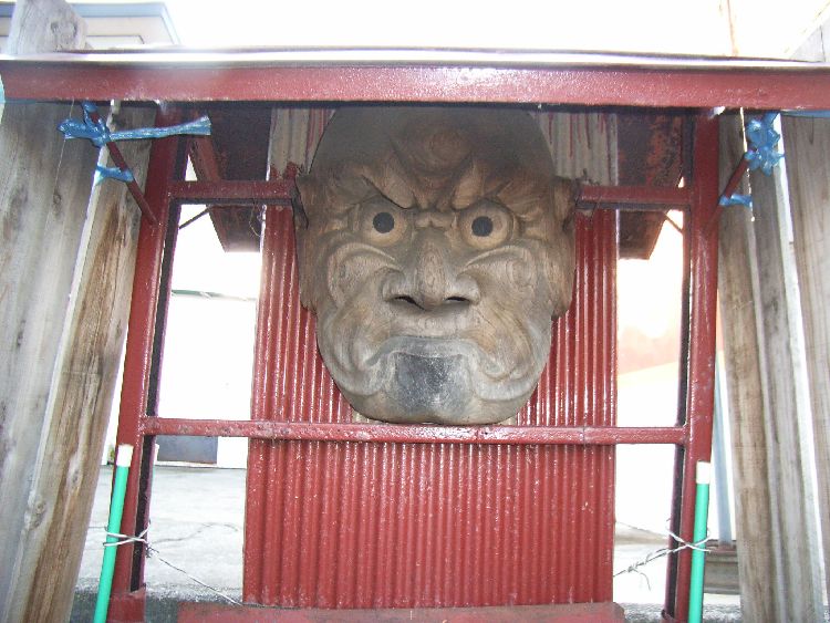 )。毎年作り替えるのが常だったらしく現在では面だけになってしまったようです。右の写真は円満造翁が作ったとされる仁王面でガソリンスタンド付近に鎮座しています。 このような風習が残っていることは民俗学(民俗風習)的に大変珍しく興味深いところです。