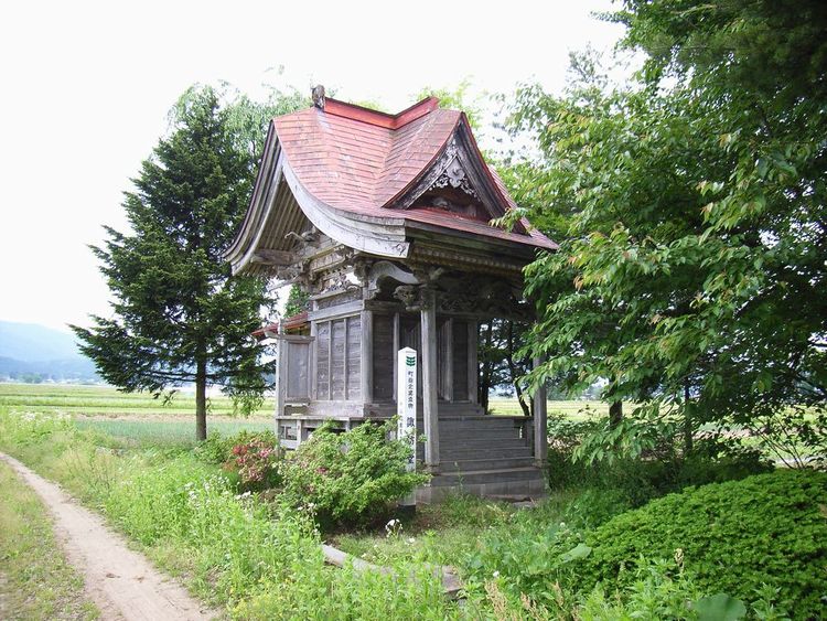 案内板によると「この御堂は、北田家の内神で明治17年に当村の宮大工高橋市蔵に建築を依頼しました。高橋市蔵は俗称を「円満造さん」と呼ばれドンパン節の作者としても知られています。彼はこの仕事に2年の歳月をかけたといわれ、青年期の心魂を注いだ作品といわれています。社殿は9尺4面社で入母屋流れ造り、三方に廻縁をめぐらし、軒4面には龍頭の彫刻がほどこされています。また、左右に象鼻を出し、外陣向拝には龍水の彫刻が組み込まれています。小さな社ですが、個性的で精巧なつくりは高く評価されています。昭和50年に町重要文化財(大仙市指定)に指定されました。」とあります。