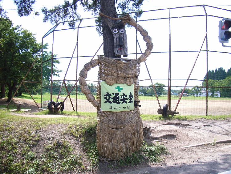 )は見られず小学校の正面にある為、当時の村境などの交通の要所なのかも判断できませんでした。その為、伝統的なものかは分かりませんが、現在では郷土学習の一環として子供達が製作を手伝っているようです。顔は同じ能代市にある鶴形のものに近く自然木を利用したもので、高さは2m以上ありますが胴体部が簾状の為、重厚なイメージはありません。細く長い腕が大きな特徴で、秋田県内ではこの様な形態は少ないとユニークな存在と言えます。村境に立ち、悪霊や疫病を追い払うというよりは、子供達の交通安全を見守るといった意味合いが強くなっているようです。