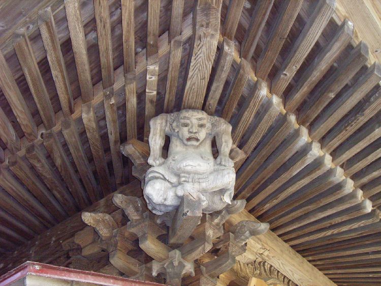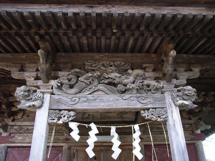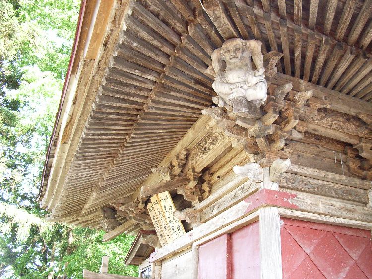 主要道からは若干中に入る為、多少解りにくい所に鎮座していますが、境内は程よく広く、集落のイベントなどに利用されているようでした。愛宕神社拝殿は入母屋の鉄板葺きの屋根で桁行3間、梁間2間、正面1間向拝付の小ぶりの建物ですが、彫刻はかなり凝った造りになっています。横手周辺では比較的多い屋根の4隅に力士像が鎮座しています。時代背景からか、力士像は周辺の神社で見られる太身でがっしりとして鬼のような形相をしているものに対し、愛宕神社では細身でより人型に近い形になっています。