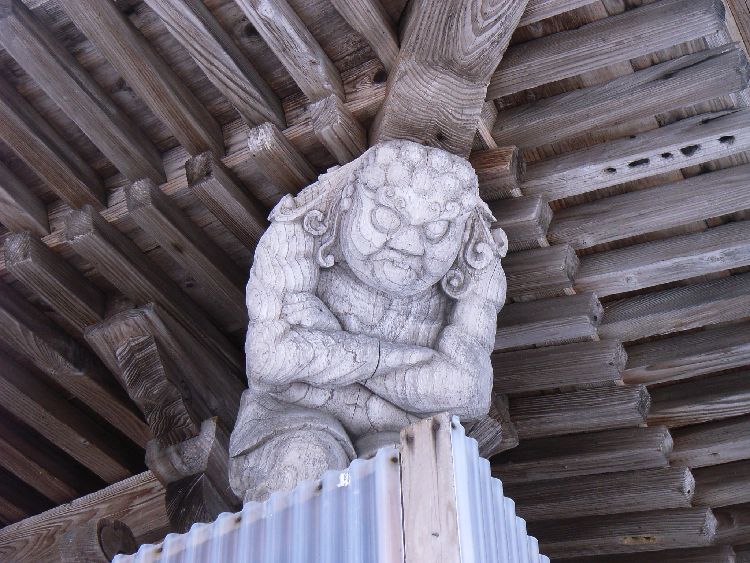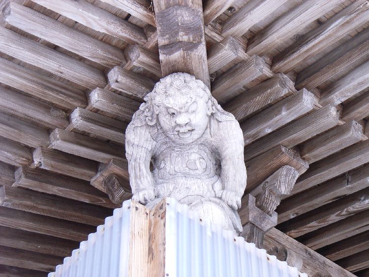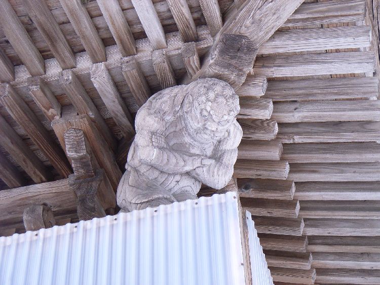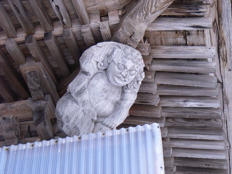 今木神社は集落から少し離れた田んぼの中央にあり、社殿の向きも集落へ特に向いていない事から、この場所に何か由来があるのかも知れません。境内には古社らしく大木が生い茂り雰囲気があります。今木神社社殿は木造平屋建て、入母屋、鉄板葺、平入、桁行3間、正面1間向拝付、外壁は真壁造り板張り、さほど大きくはありませんが、彫刻がかなり凝っていて、横手市では多い力士像も4体屋根を支えています。祭神:日本武尊、建御雷神、経津主神、天照大神、月読神。