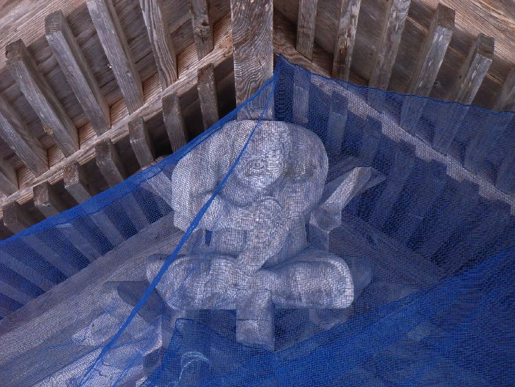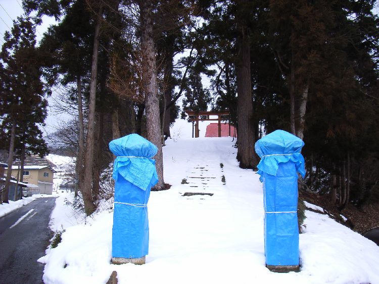 | 亀田・稲荷神社(横手市増田町)概要: 稲荷神社には亀に載った子供が夢の中に出てきて、「ここに堰を造り田を開きなさい」と告げ、現在の亀田堰の最初になったという伝説が残っています。亀田集落の開村が江戸時代初期の元和8年(1622)との事ですから神社の創建時期もその頃ではないでしょうか。明治時代初頭に発令された神仏分離令を経て明治6年(1873)に村社に列し、明治45年(1912年)に神饌幣帛料供進社に指定されています。稲荷神社の拝殿は木造平屋建て、入母屋、鉄板葺、平入、桁行3間、正面1間向拝付、外壁は真壁造り板張り。幣殿は両下造、鉄板葺き、間口1間、奥行4間。本殿は一間社切妻造り、鉄板葺き、平入。稲荷神社の社殿は寛文2年(1662)再建とありますので、もしその通りだとしたらかなり古い建物だと言えると思います。元々が茅葺屋根のようで、かなり重厚な感じを受け、周辺地域の総鎮守らしく彫刻も凝っていて4体の力士像が風雪を耐え屋根を支えています。祭神:稲倉魂命。