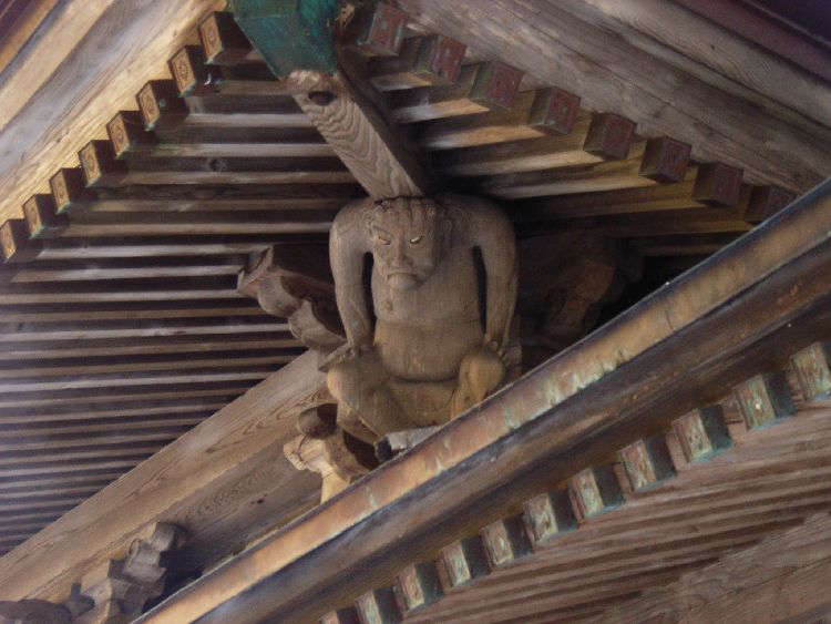 現在の薬師神社社殿は明治32年(1899)に改築されたもので拝殿は入母屋、銅板葺、平入、桁行3間、梁間3間、正面1間向拝付。本殿は三間社入母屋造り、平入、正面1間向拝付。拝殿屋根の四隅には精巧に彫り上げられた力士像が鎮座し、正面の龍や獅子なども見事な出来映えだと思います。一段高いところに本殿があり、細かい彫刻はありませんが、逆に組物の力強さを感じます。薬師神社参道は国道が横切って雰囲気が壊されていますが、集落から3つの鳥居があり、境内に多くの境内社が鎮座するなど、周囲の信仰の対象になっていた事が窺えます。祭神:少彦名神、菊理媛神。