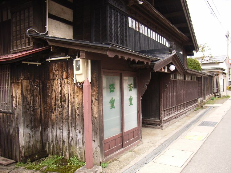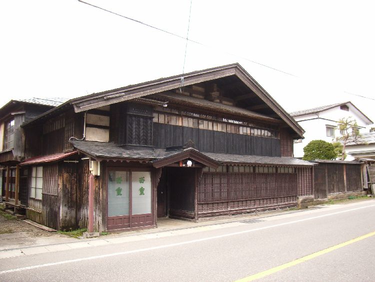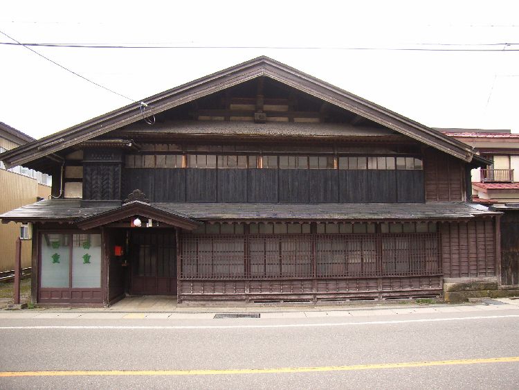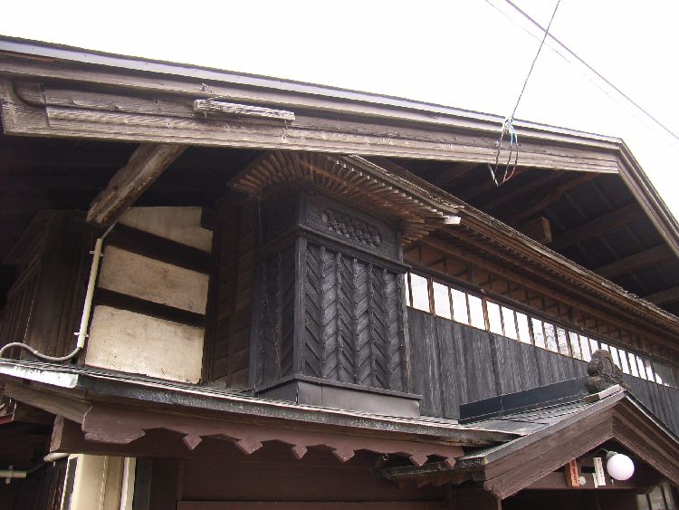 | 稲川町某商家概要: 湯沢市稲庭町にある商家建築です。2階部分が7間あり、そこだけ見ると切妻妻入り形式では秋田県内最大級といえます。秋田県の町屋は切妻妻入り形式が多い為、間口が広くなるとどうしても屋根の高さが高くなる傾向があります。一般的な町屋では4間〜5間ぐらいですからひとまわり大きいと言えます。他の町屋と写真を見比べると分かり易いのですがこの建物の屋根の勾配が若干緩く建物の高さが低く抑えられているのが分かります。建築年代は特定出来ませんでしたが、1階軒先には細かい意匠が施されていたり、2階の戸袋などはかなり意識してデザインされています。玄関は雪が直接落ちてこないよう1階下屋との勾配を逆にして、意匠を替える事で正面性(玄関としての格式)を出しています。小安街道では増田町を越えると当時からの町屋が大分少なくなってきました。出来れば長く保存してもらいたい建物の1つです。